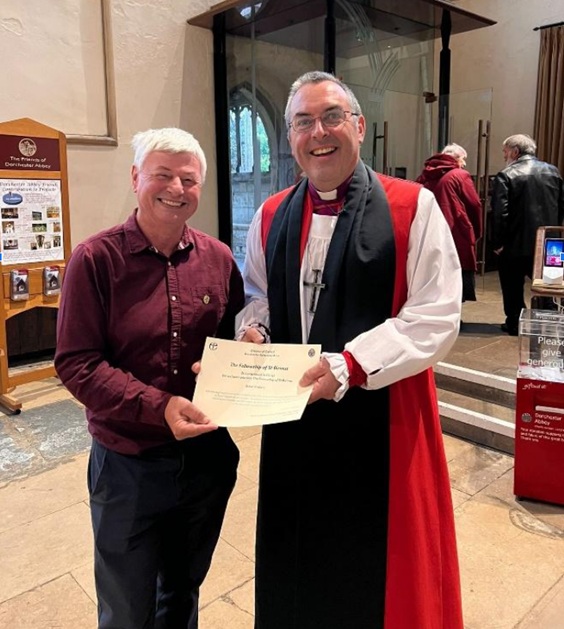 On Sunday 14th September 2025 at Dorchester Abbey, Steve Vickars was one of fourteen people who received the award of the Fellowship of St Birinus. Steve was nominated by Rev. Gareth Miller, Rector of the Akeman Benefice and Area Dean of Bicester and Islip, for his work over several years as Tower Captain of St Mary’s Kirtlington, and in leading practices, training and recruiting – not only at Kirtlington, but also at other towers in the Benefice and further afield.